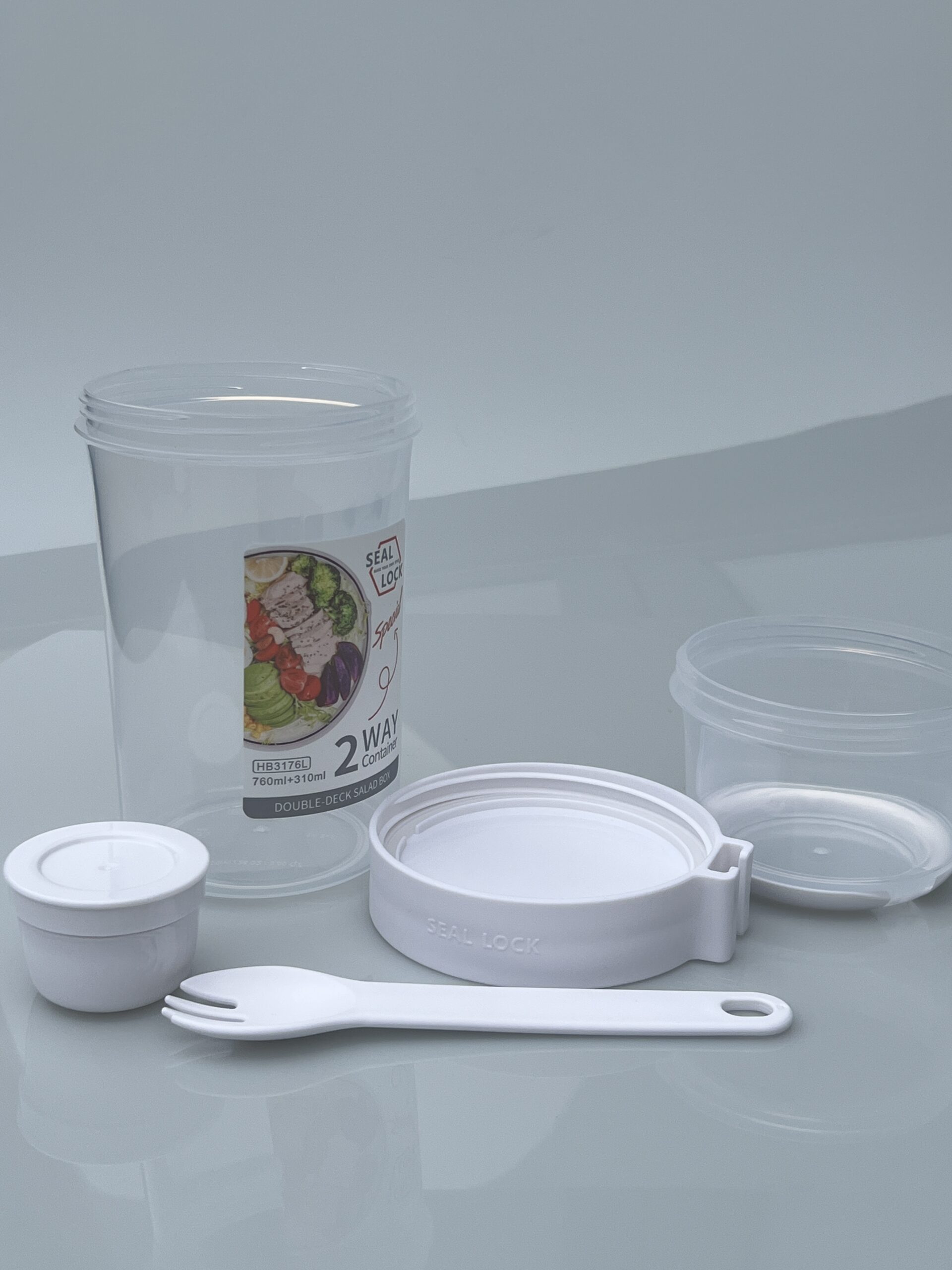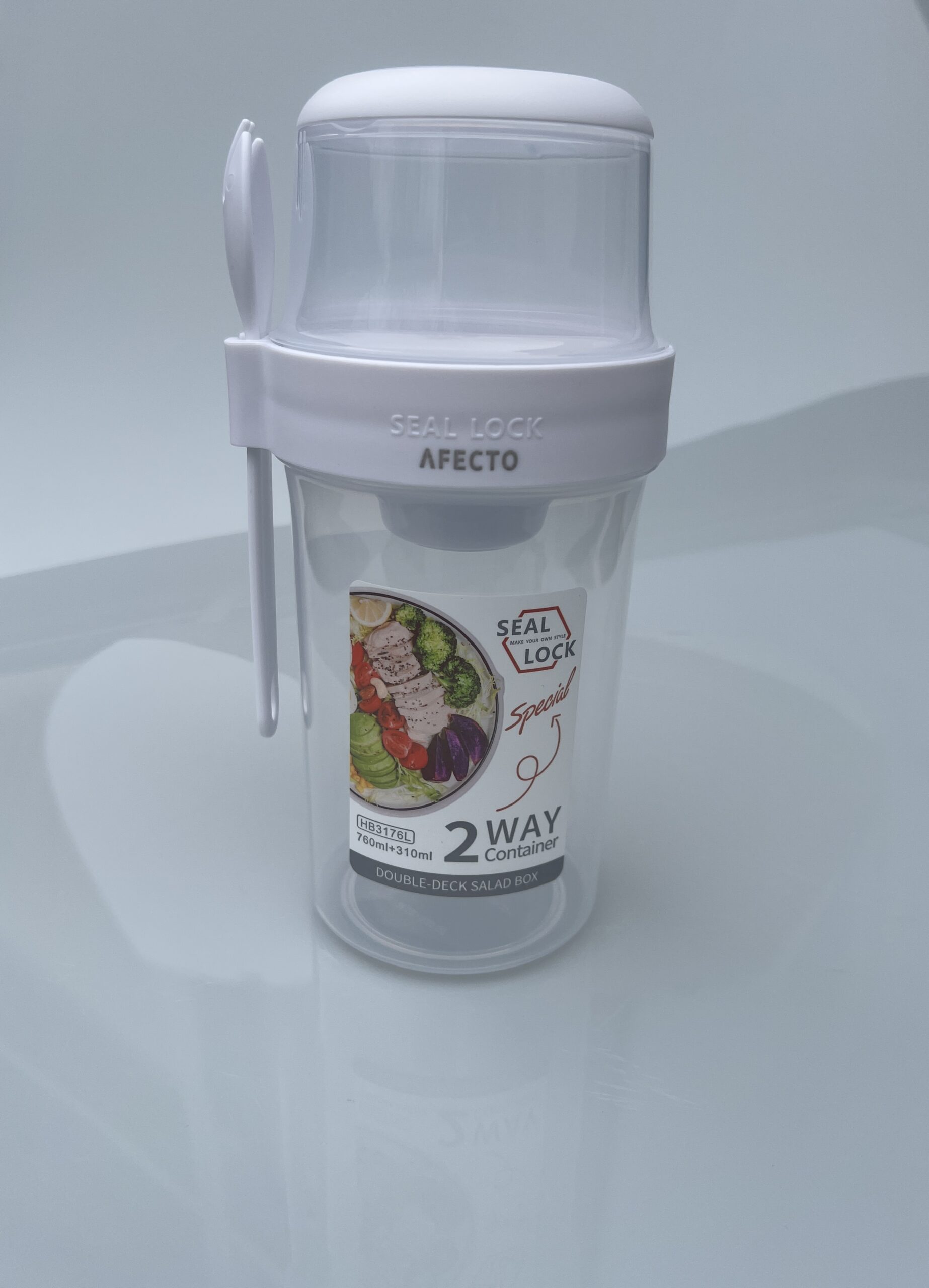 Deze stevige Yoghurtbeker / Muesli beker to go is uitstekend geschikt voor het lekvrij meenemen van ontbijt of lunch. Transparant zodat je altijd kunt zien wat erin zit. Deze set bestaat uit 3 bakjes die in elkaar gedraaid kunnen worden. Een grote beker en een kleinere voor bijvoorbeeld muesli. Het kleinere bakje is perfect voor een lekkere saus. Compleet met een vork zodat u alles bij de hand heeft.