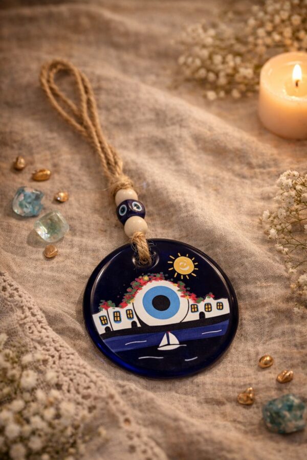 Een grote 8 cm glazen hanger met een blauw oog is een traditioneel amulet afkomstig uit Turkije en Griekenland. Men gelooft dat deze hanger beschermt tegen het ‘boze oog’, een jaloerse blik die volgens de overlevering ongeluk kan brengen.