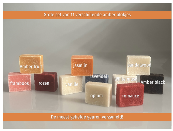 Ontdek de heerlijke geuren van deze grote set van maar liefst 11 amber geurblokjes inclusief schaaltje